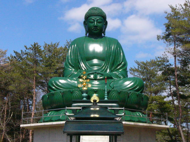 乙ケ崎地区の海岸の高台の「真和園」に2003年6月に建立されました。高さが8.4メートルあり、日本三大大仏のひとつ富山県高岡市の「高岡大仏」よりも大きいそうです。
